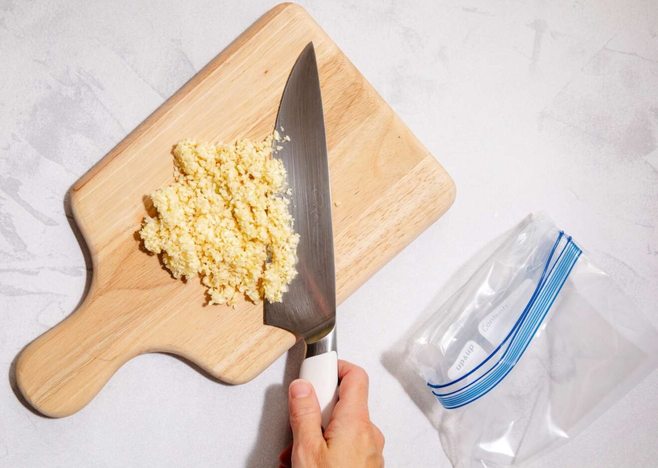 After mincing a head or two (or three! or 10!) of garlic, transfer it to a resealable plastic bag. Remove all of the air and seal it. Press the garlic in an even layer then use a large chef’s knife or pastry cutter to make lines to create tiny squares. Make indentations, not cuts, being careful to not press too hard and cut through the bag. Transfer the bag to a small baking sheet and refrigerate until firm, about 1 to 2 hours.