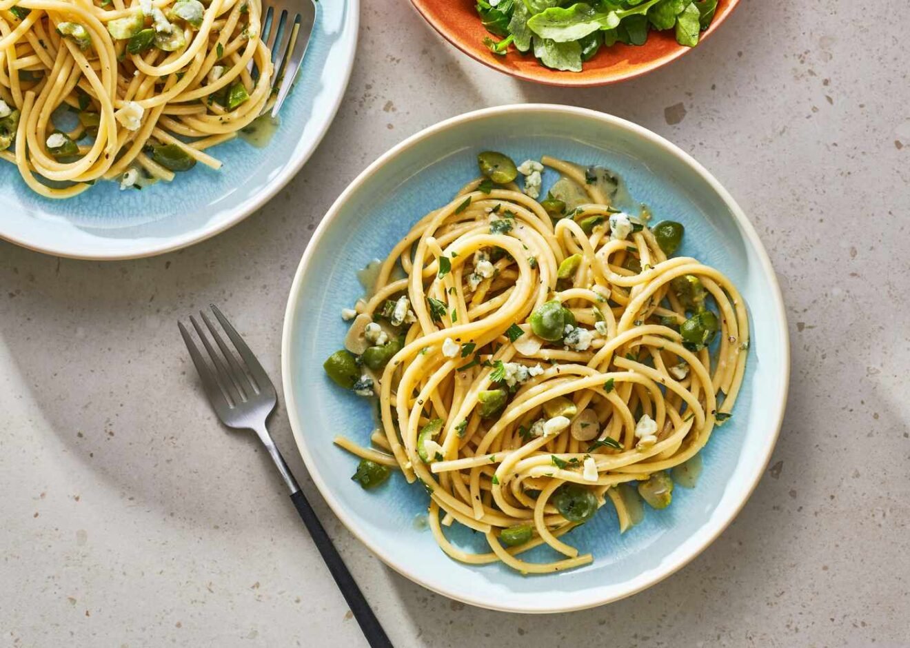 Add 1/3 cup chopped fresh parsley, a few generous grinds of black pepper, and half of the blue cheese, crumbled; toss to combine. Adjust the consistency of the sauce with more pasta water, if desired. Serve garnished with more parsley and the remaining blue cheese.